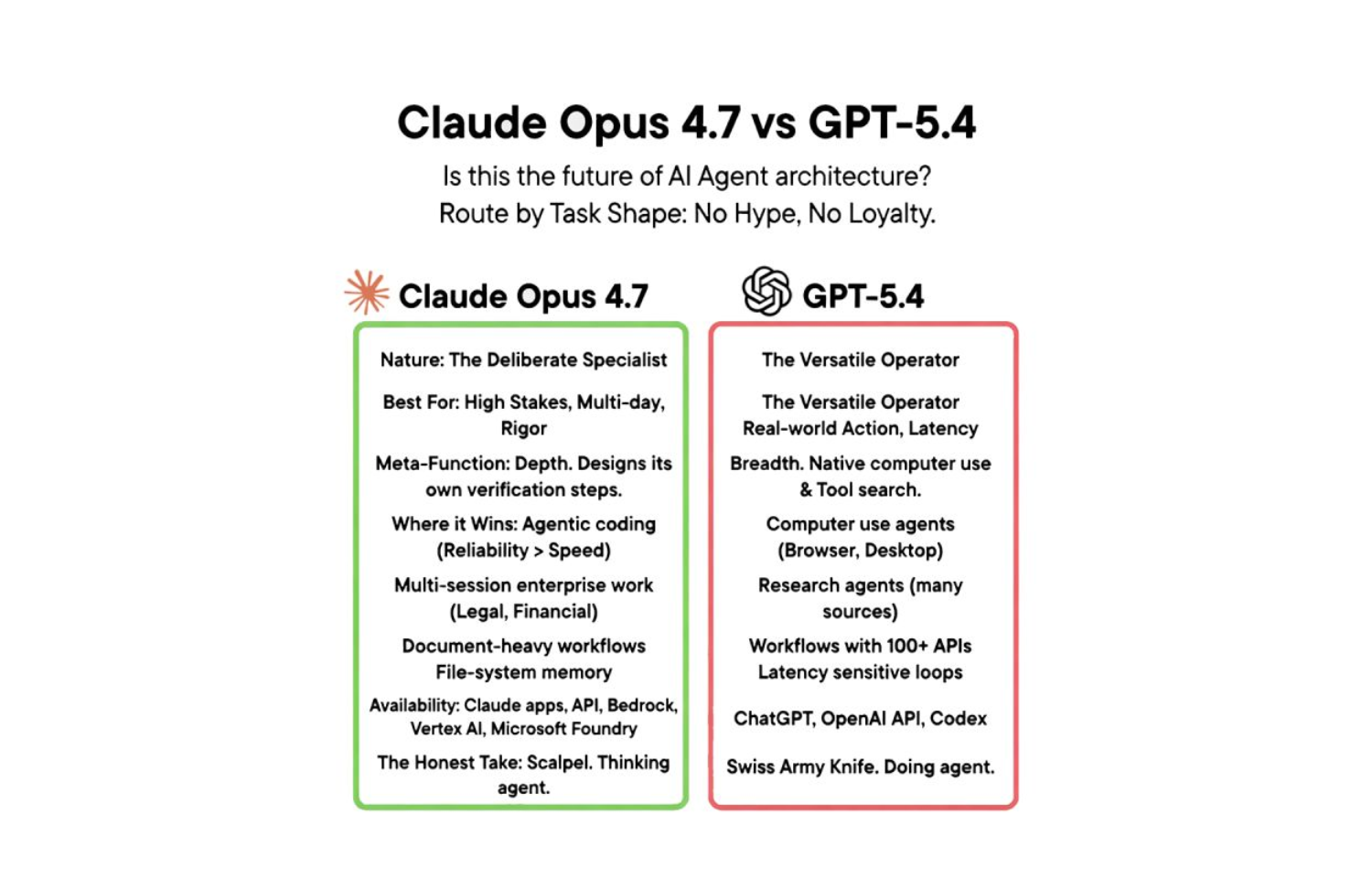 Here is the honest take: Claude Opus 4.7 and GPT-5.4 are not competitors in a race. They are instruments designed for different cuts. Picking between them by benchmark score is like choosing a scalpel over a multi-tool based on which one costs more. That is not the dimension that matters when you are in the operating room.
